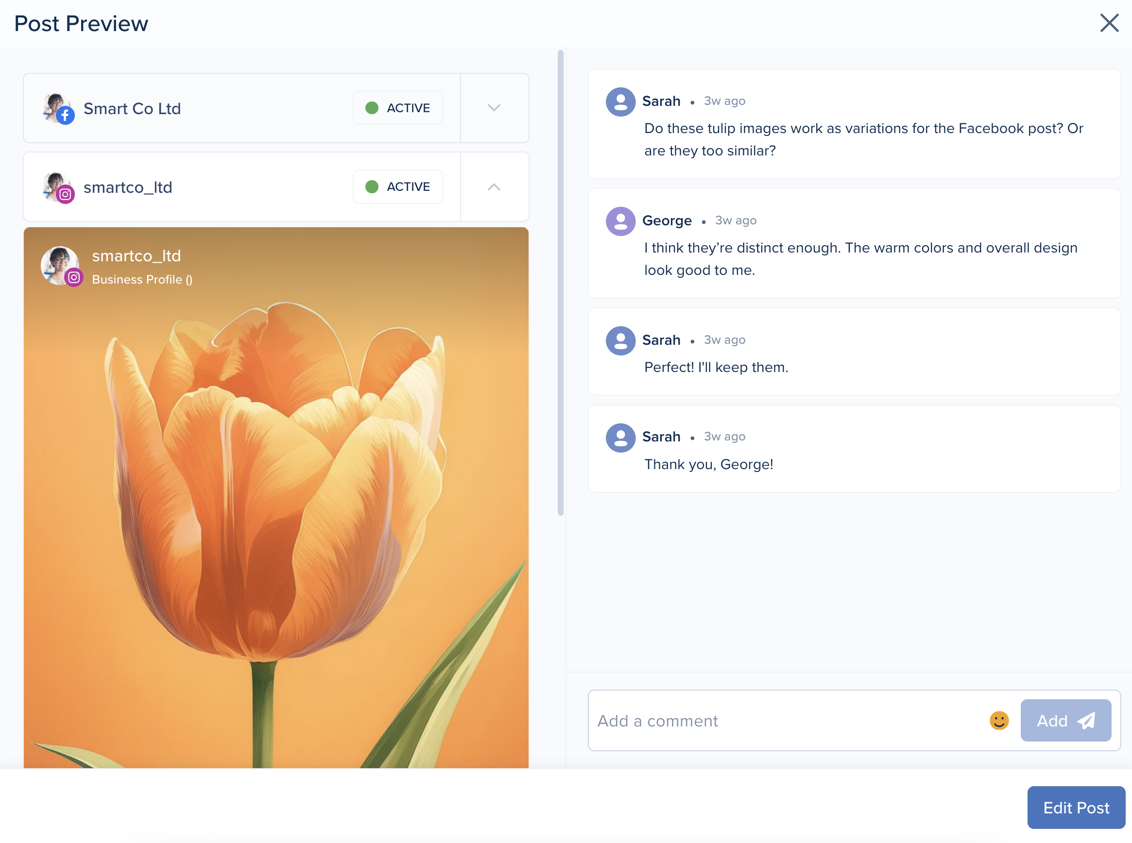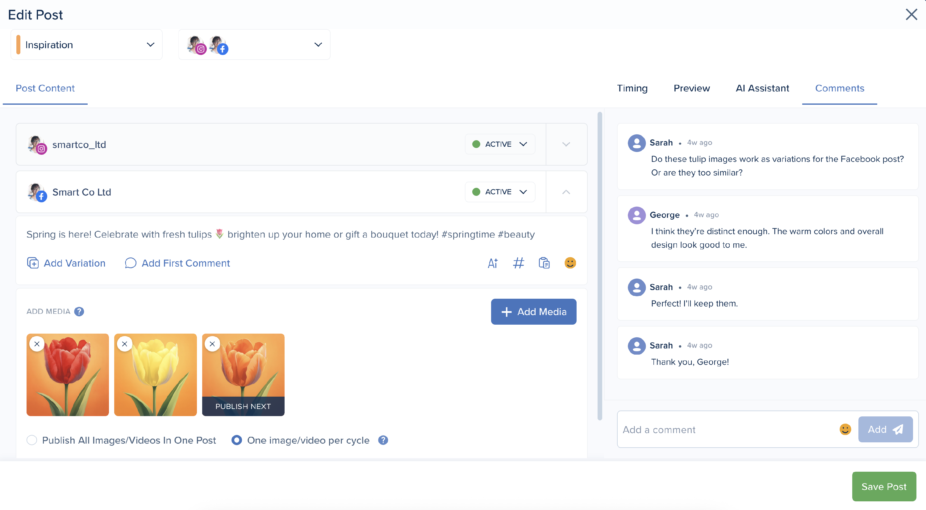 Share notes, approvals, or feedback directly on posts in the Post Editor or Queue, without relying on outside tools.