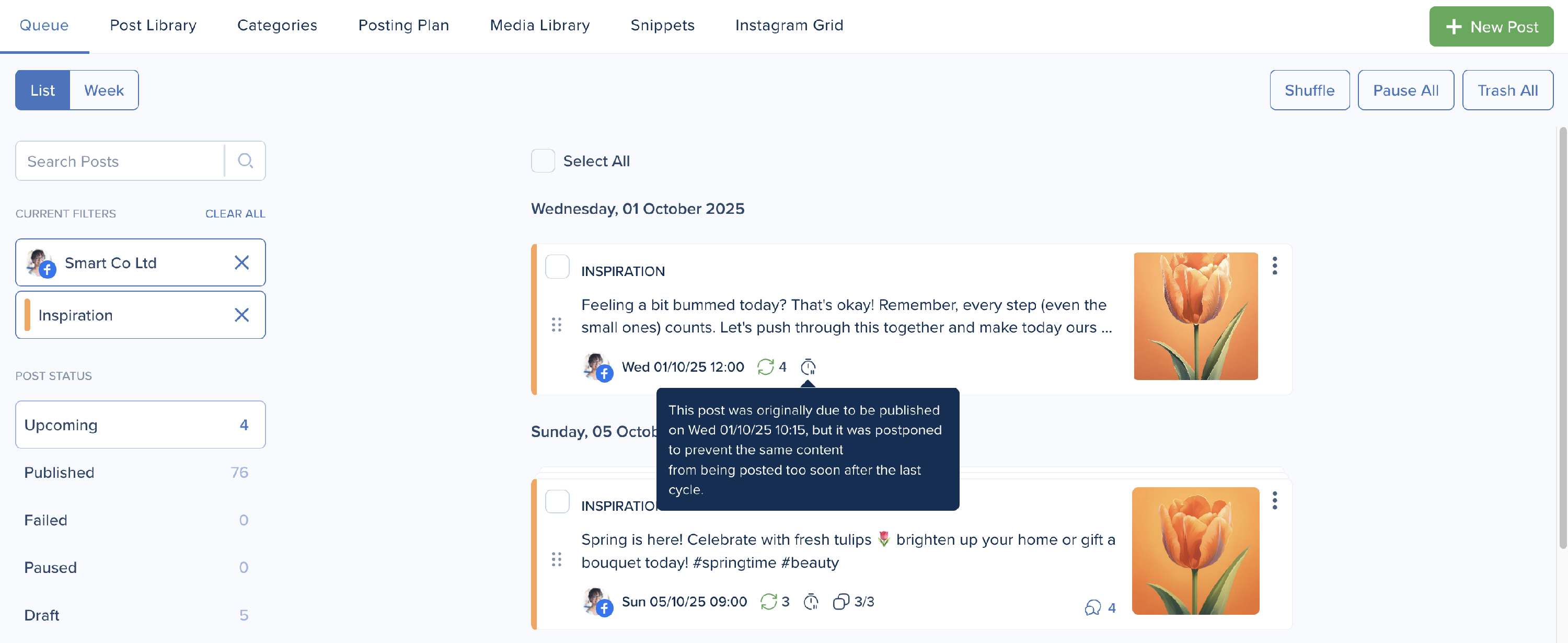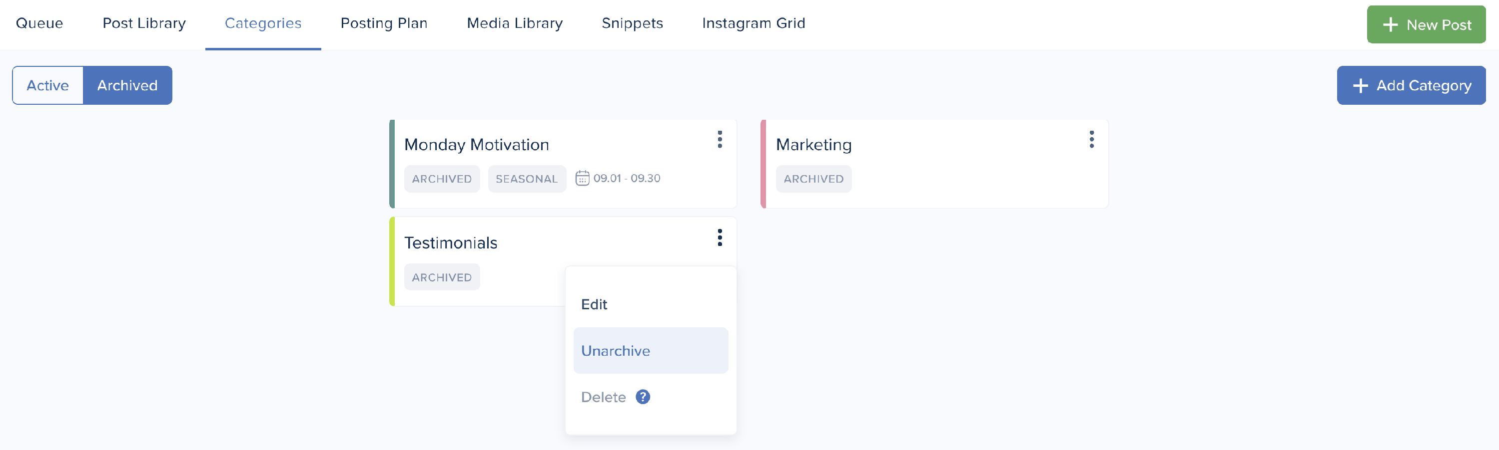 Keep your Categories organized by archiving campaigns or themes you’re not currently using, making room in your Queue without losing any posts or analytics.