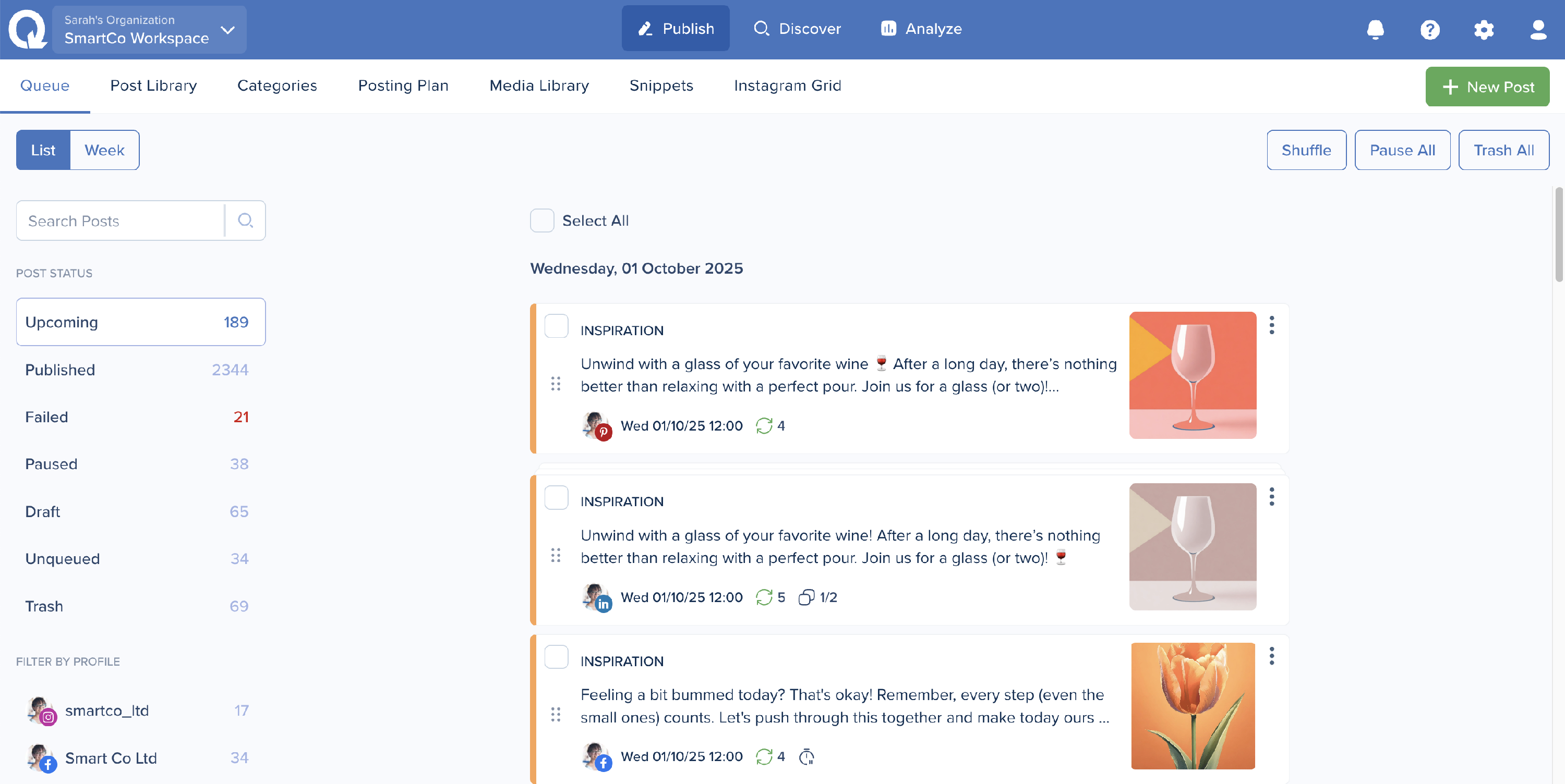 Everything you loved about publishing in the classic SmarterQueue is still here, enhanced with customer-requested improvements and powerful new features. All of your publishing tools, including the Queue, Categories, Post Editor, and content libraries, now live together in the new "Publish" section. This makes your workflow faster, simpler, and more organized, so you spend less time scheduling, more time engaging your audience, and have more ways to keep your content fresh.