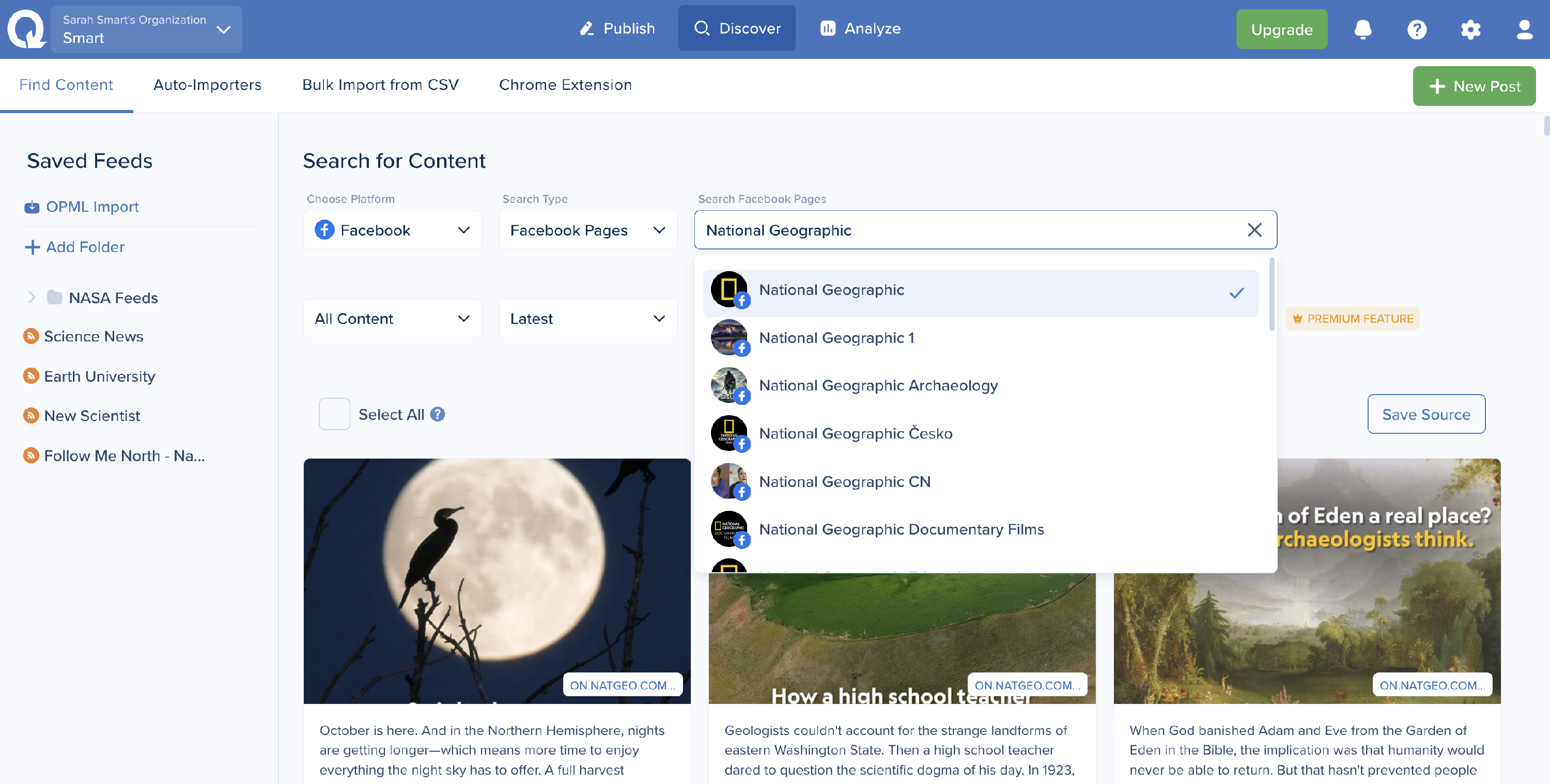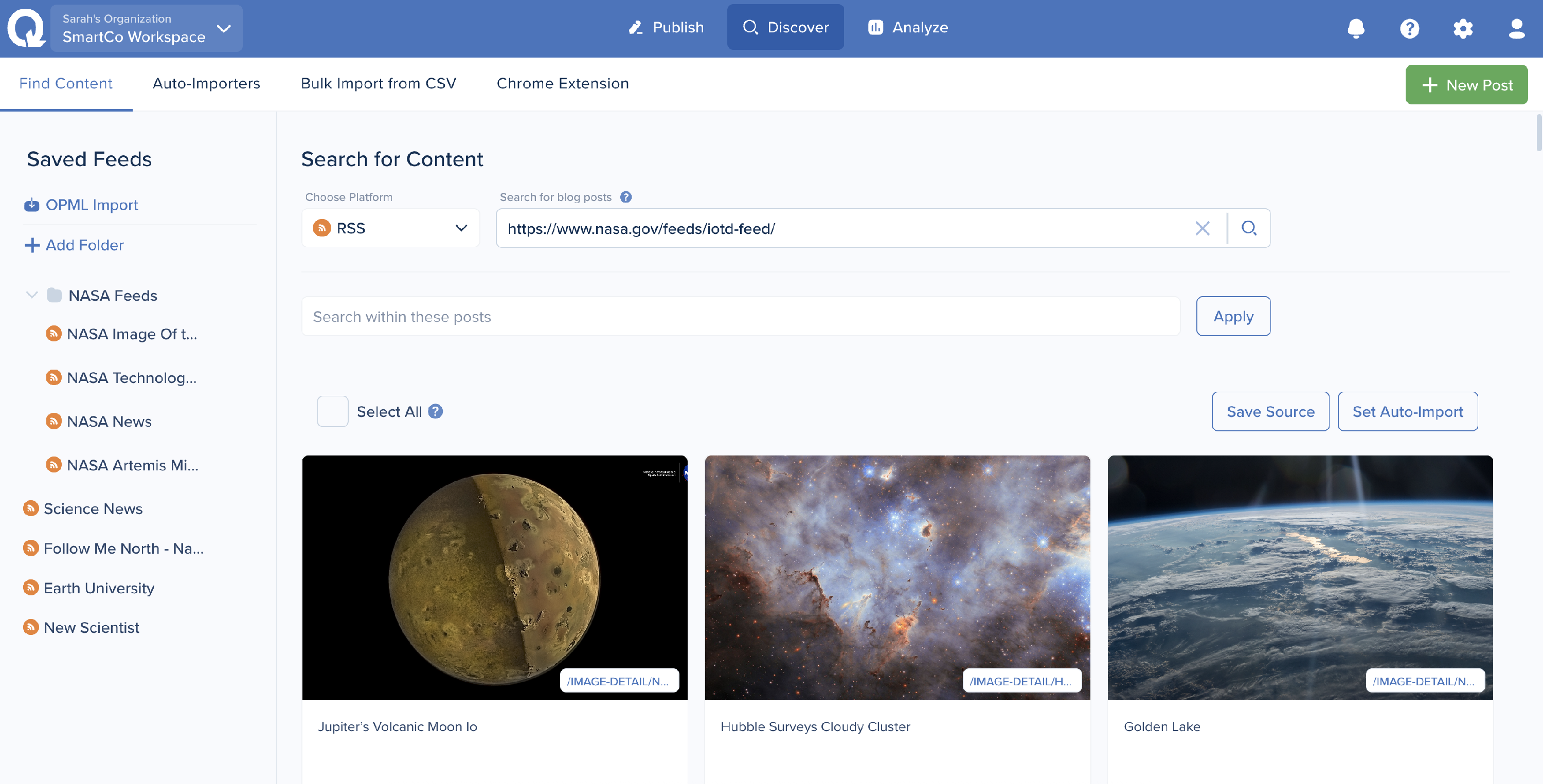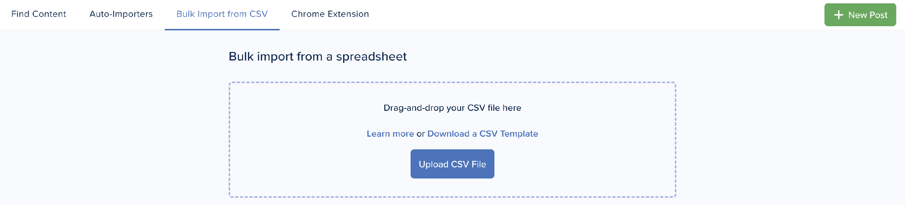 Everything you need to find and import content is now clearly organized in the new "Discover" section. This includes Find Content, Auto-Importers, CSV Upload, and more. With everything in one place, it’s simple to keep your Queue stocked and your content pipeline flowing.