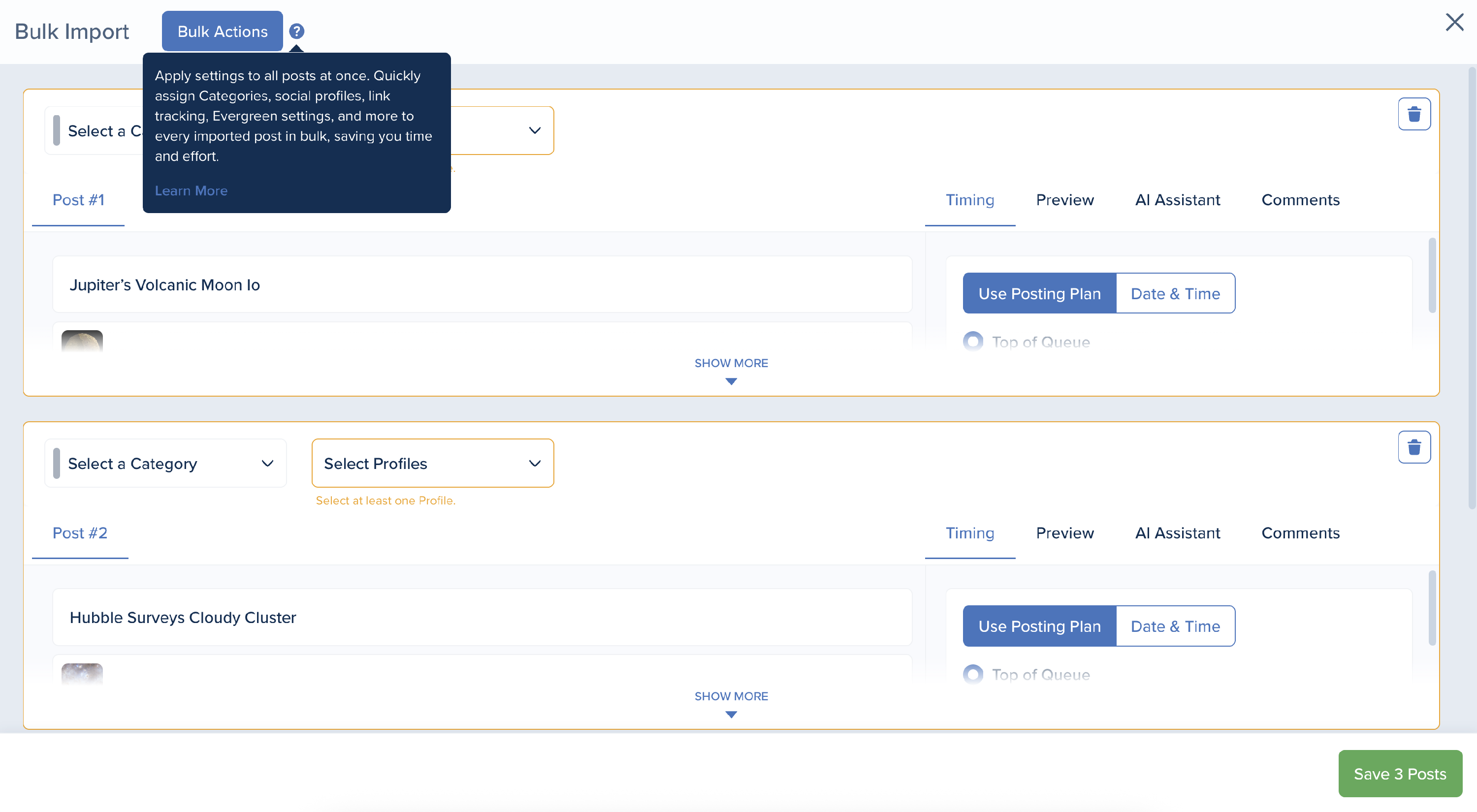 Apply selections for Category, Evergreen status, or profiles to dozens of posts at once. Make changes in bulk, then fine-tune individual posts before you import.
