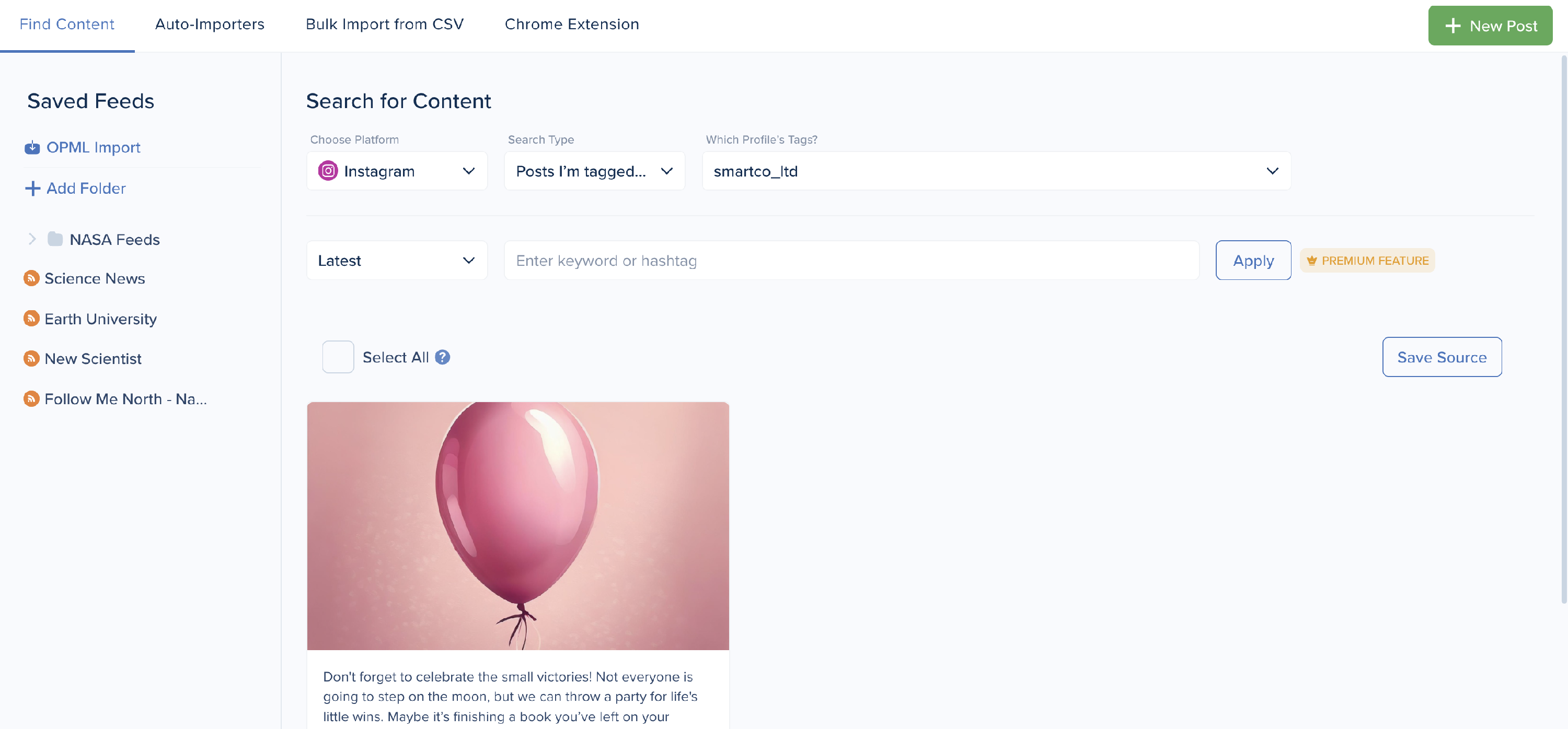 Just as you’ve always been able to import from any public Facebook Page, you can now do the same with Instagram Business profiles to curate industry content, keep tabs on competitors, or share from trusted partners.