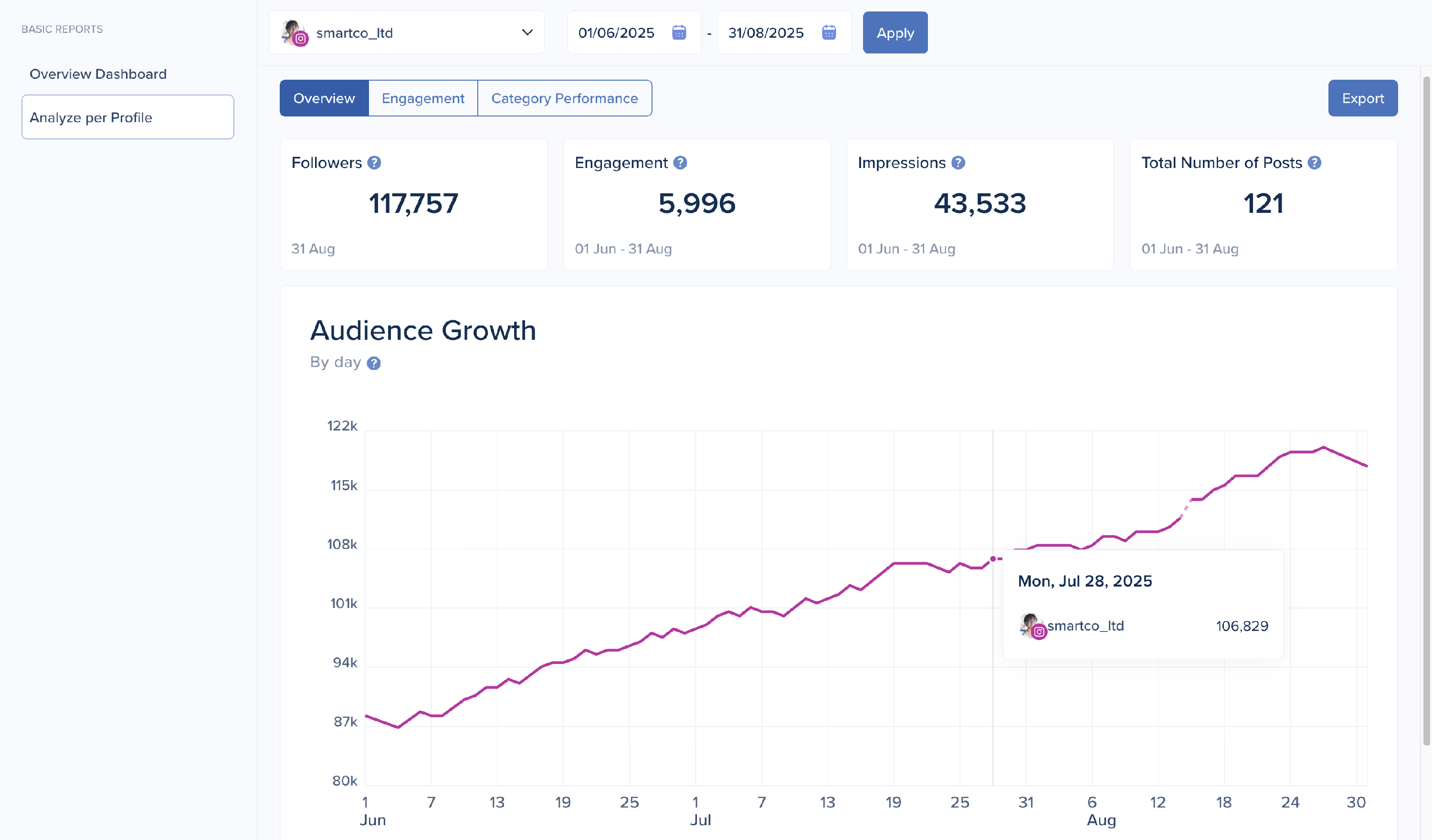 Use the Overview Dashboard to see growth and engagement trends across accounts side by side, with color-coded charts that highlight differences.