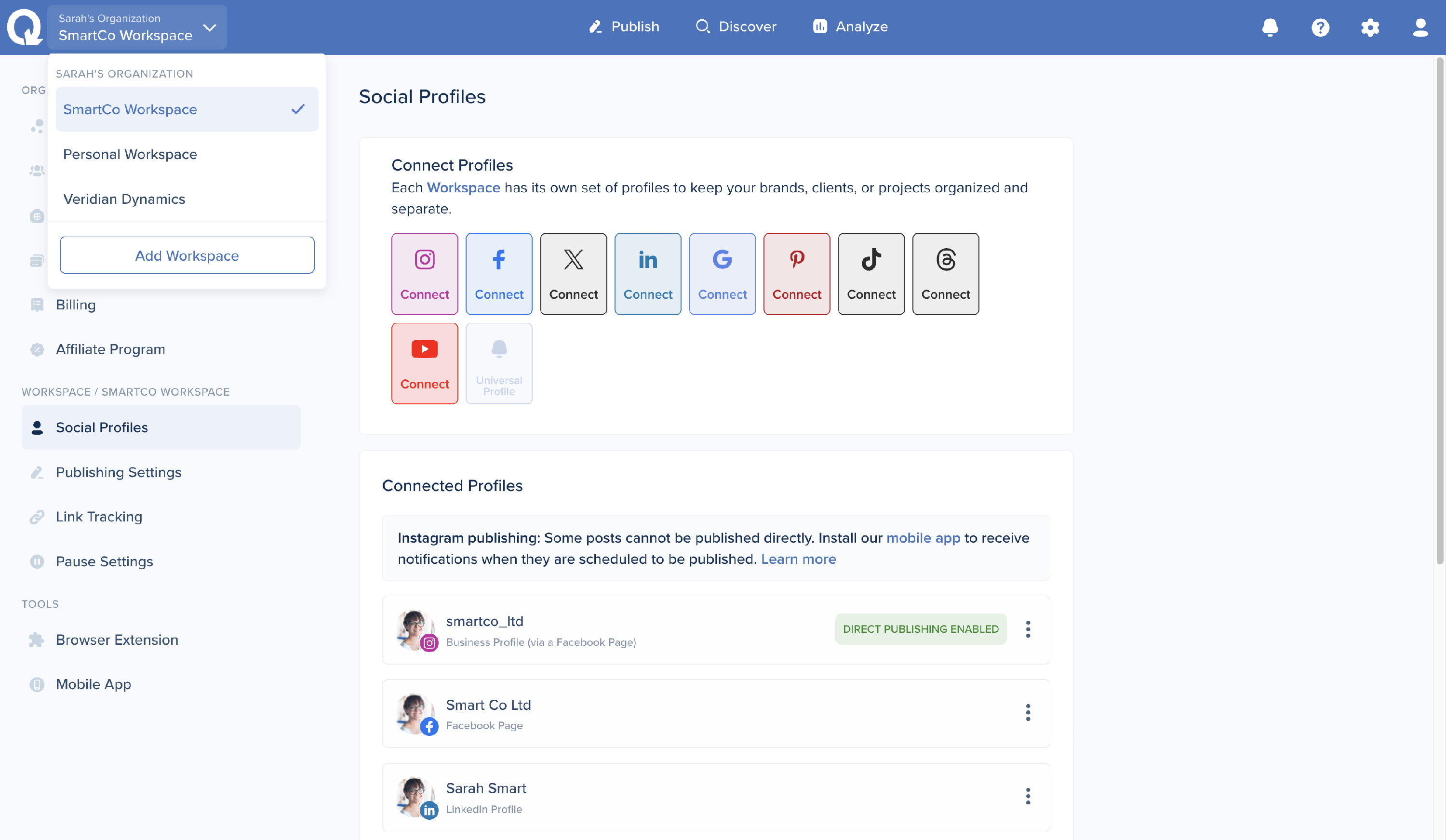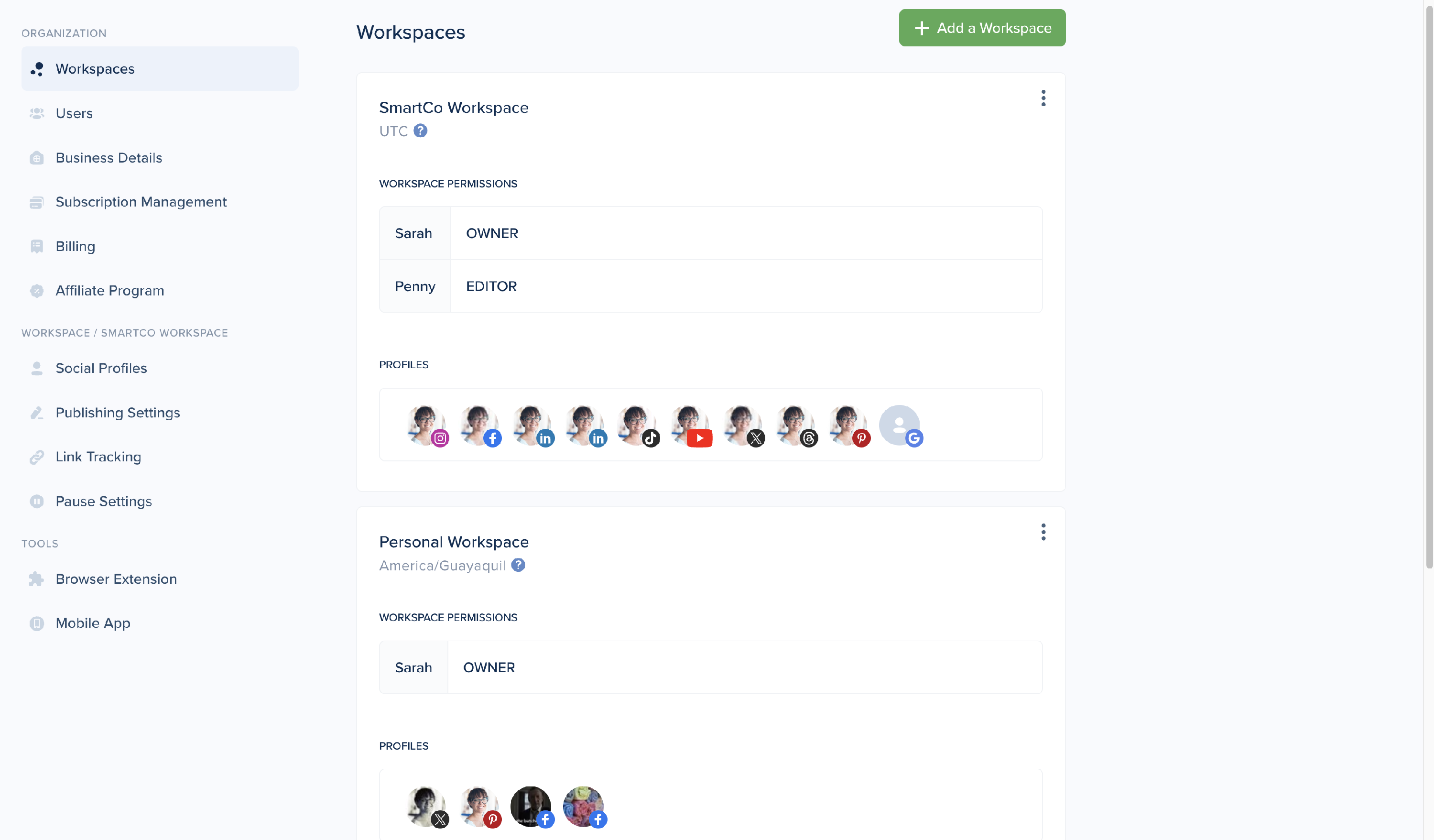 For everything else, you’ll now find it organized under Settings. Some options are personal to you, while others are Workspace-dependent. This includes managing social profiles, publishing defaults, pause controls, and link tracking, all of which are now specific to each Workspace.