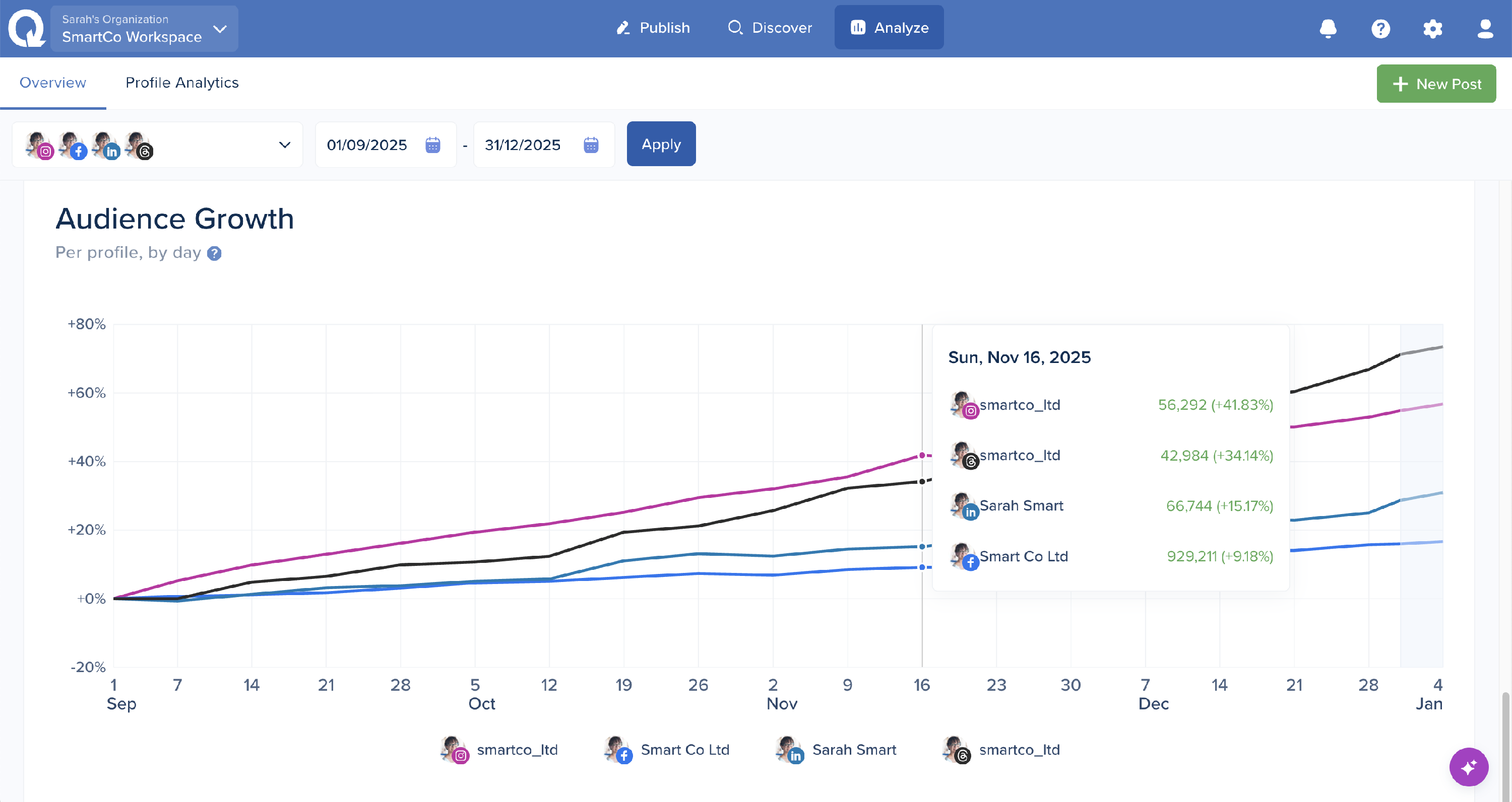 When you want the broader context, Profile Analytics lets you review performance for supported social profiles using platform data (where available via their API). This view can include results beyond what was published through SmarterQueue, helping you understand overall trends and baseline performance.