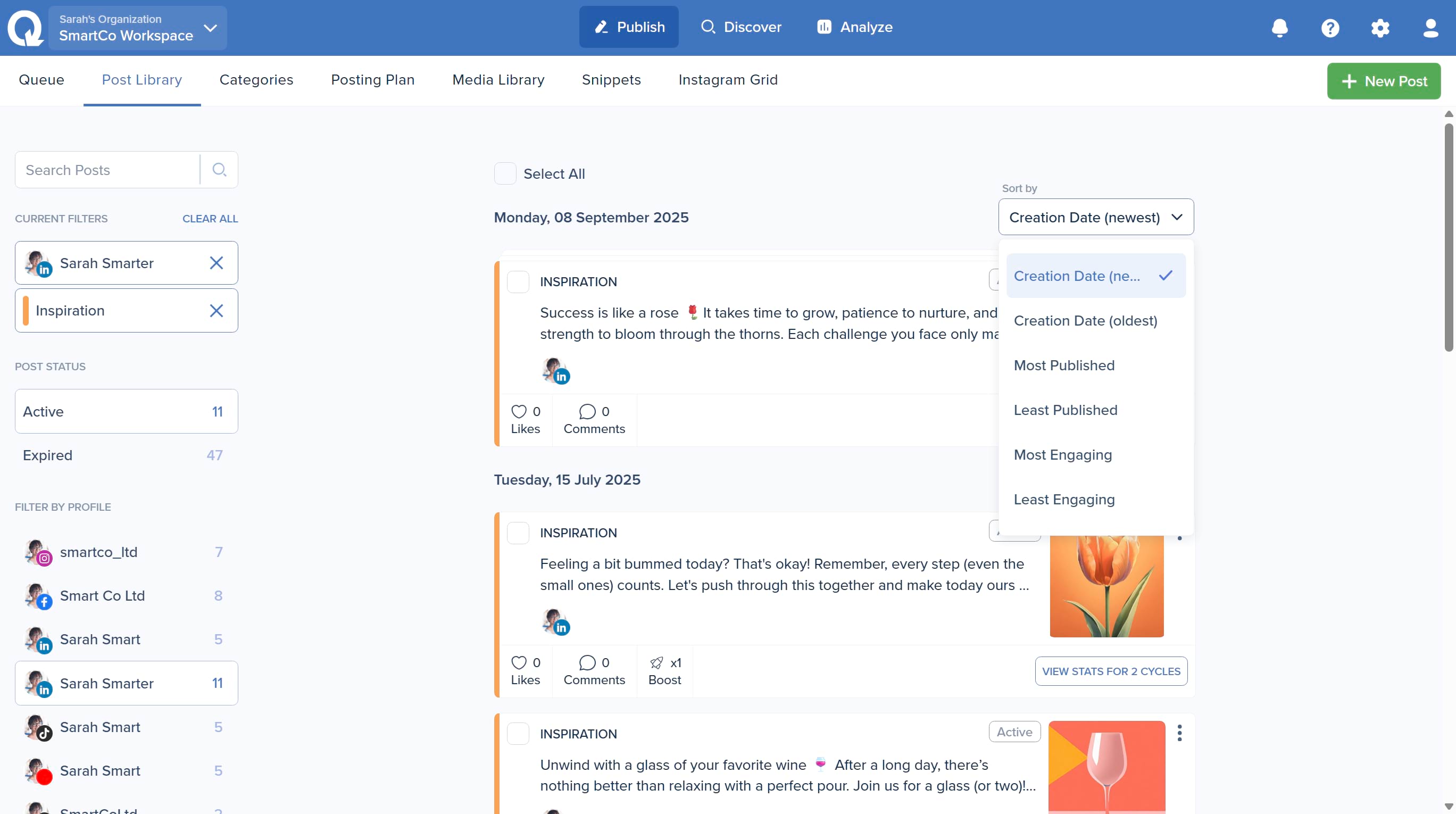 For the first time in SmarterQueue, you now have a dedicated hub for every post you’ve ever created. The Post Library makes it easier to track, refine, and reuse your content so nothing goes to waste.