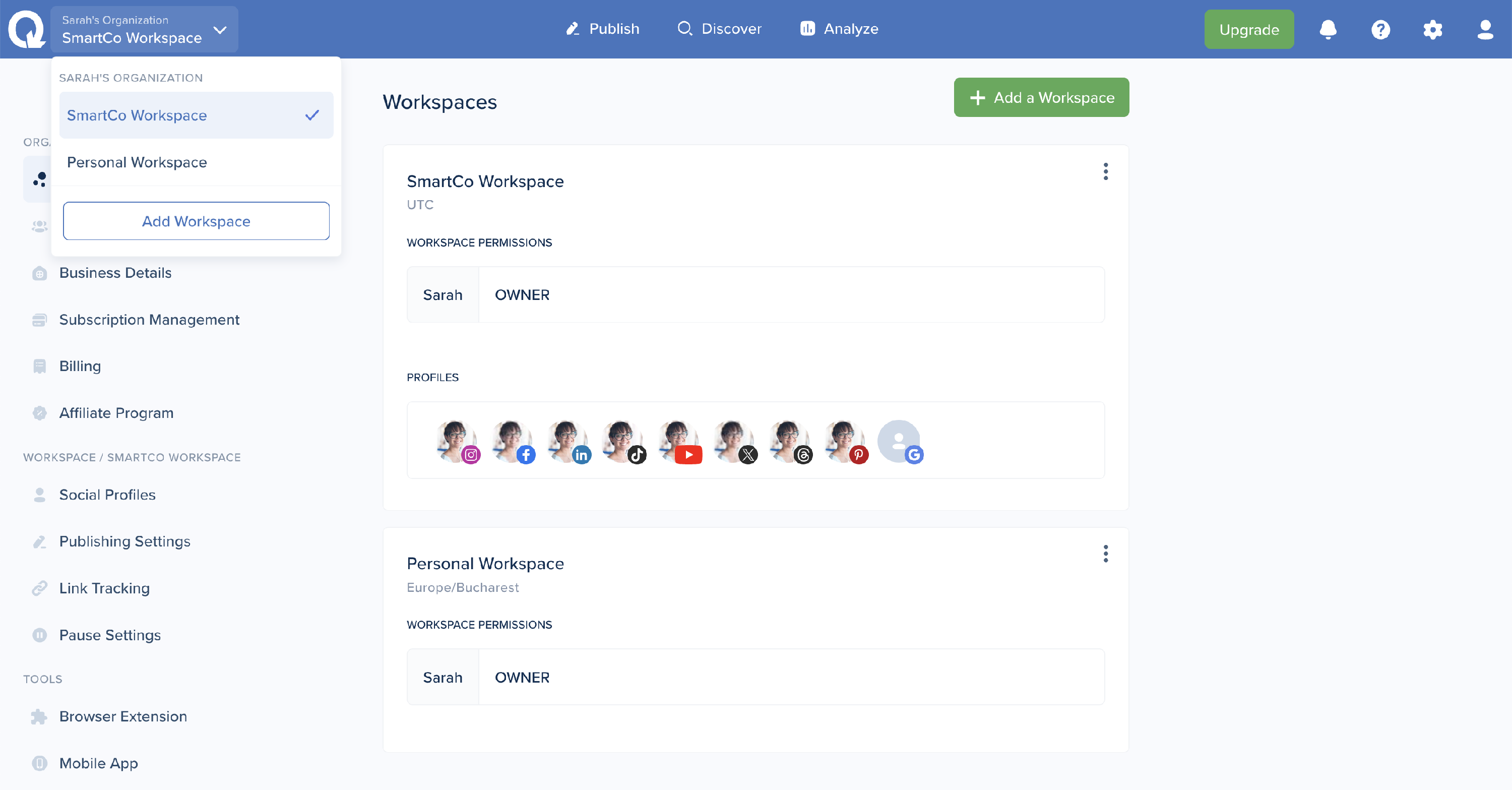 Workspaces let you separate brands, businesses, clients, or pen names into their own dedicated dashboards, keeping content, profiles, and analytics neatly organized.