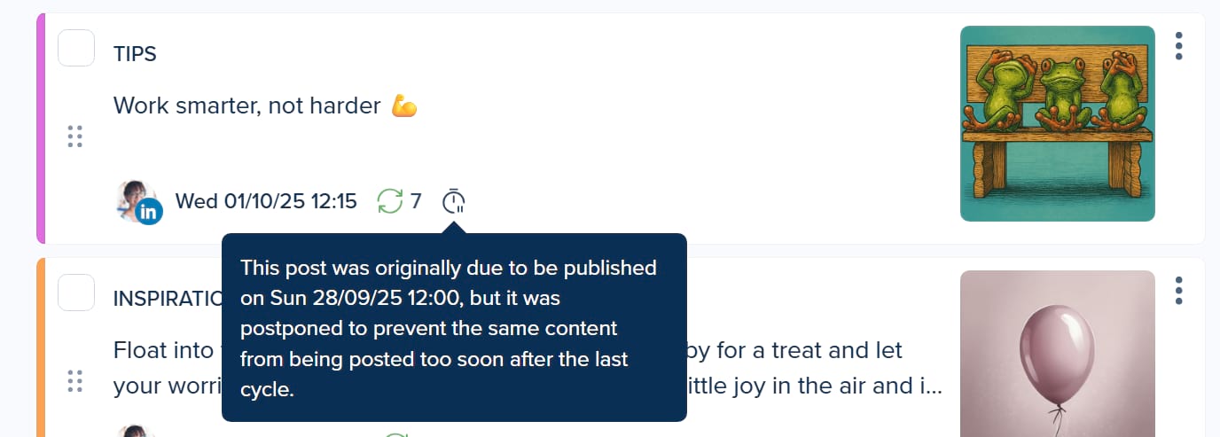 ⏳ Minimum Time to Recycle. Set a required gap between repeats so posts don’t resurface too soon. The default is one week, with custom options coming soon. |