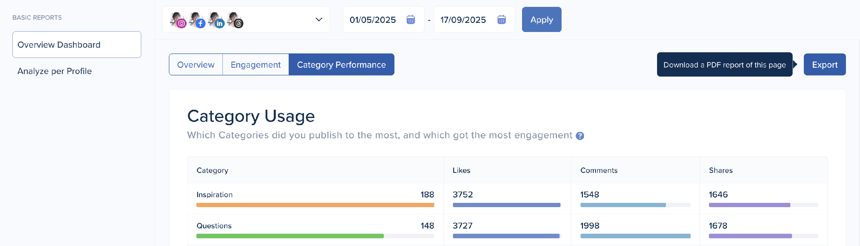 ✨ Export analytics as polished PDF reports, complete with charts and tables.