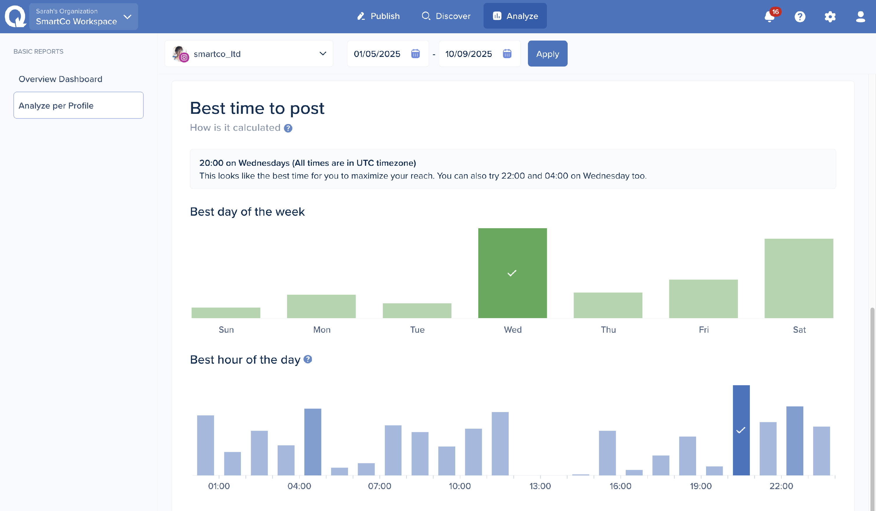 ✨ Analyze per Profile. Focus on one account at a time with the same three tabs: Overview, Engagement, and Category Performance, streamlined for a single profile. Best Time to Post: In the Engagement tab, see your top days and hours to post. SmarterQueue also recommends 1–3 optimal times based on your data. See more below! |